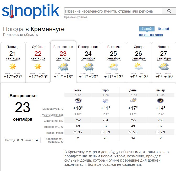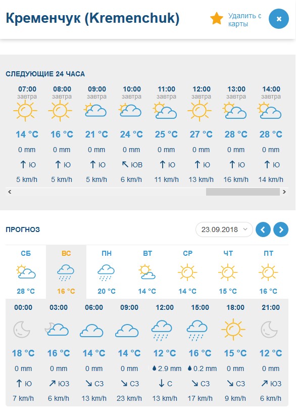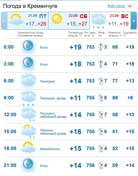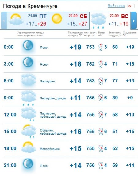 За прогнозом Gismeteo, у неділю, 23 вересня, цілий день йтиме дощ. Температурний мінімум на вікенд - +11°C.