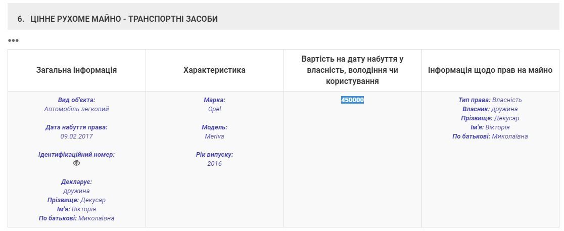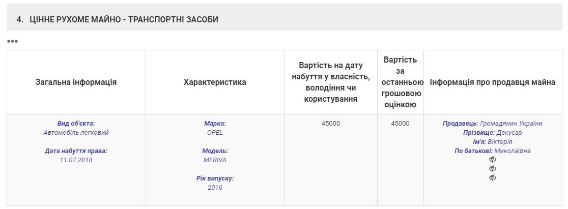 Згідно з документом, Валерій Декусар купив у дружини автомобіль OPEL MERIVA, 2016 року випуску. Ціна покупки коштувала 45 000 грн.
