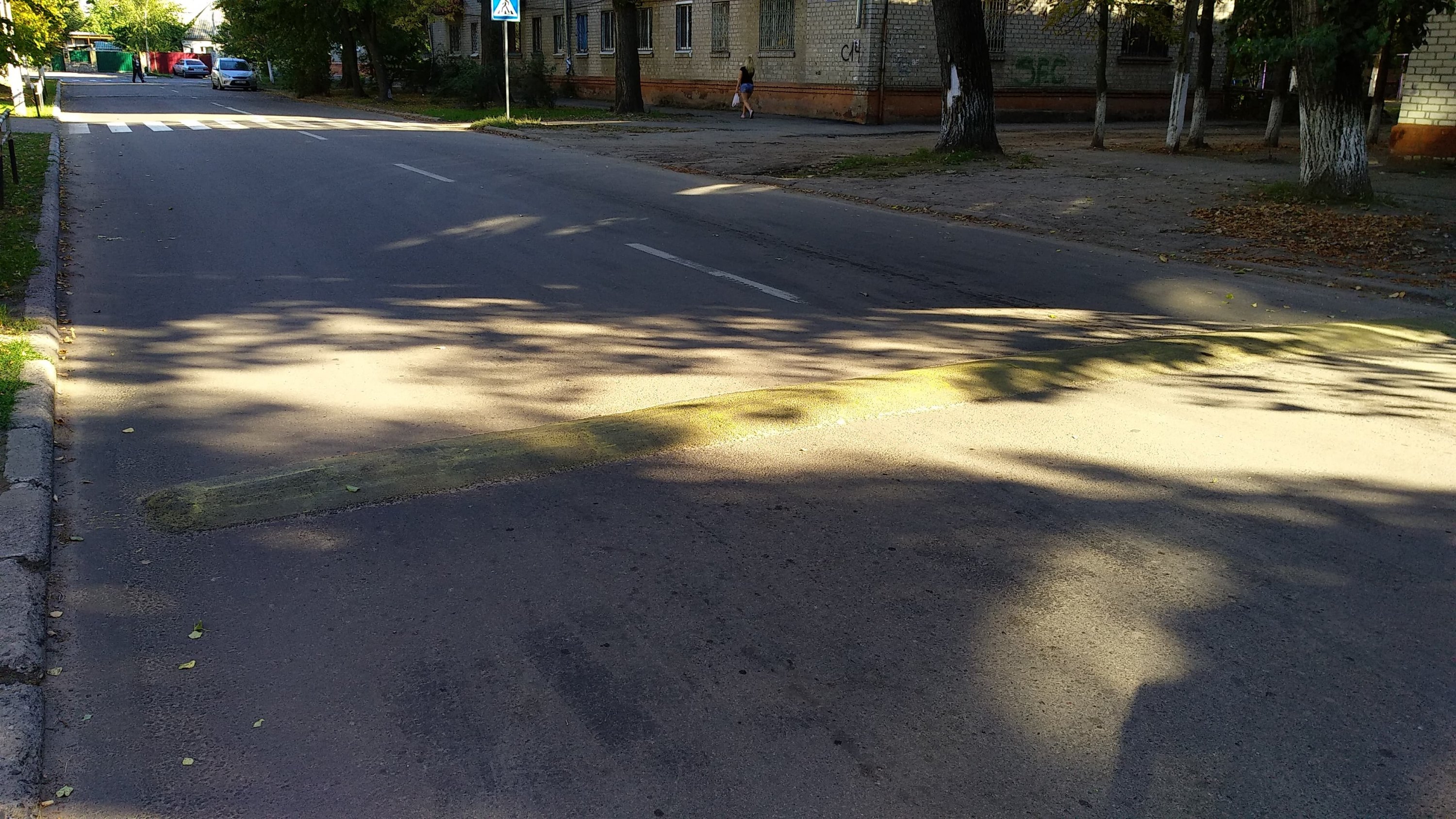 В Кременчуге, в переулке Гвардейском, замечен лежачий полицейский под прикрытием. Это уже обычная для нашего города асфальтобетонная возвышенность, выполняющая роль средства принудительного снижения скорости. «Полицейский» лежит в районе пешеходного перехода у школы №18. И многим водителям его не видно даже после покраски. Малярам, видимо, не хватило краски и они сделали всё, что могли.