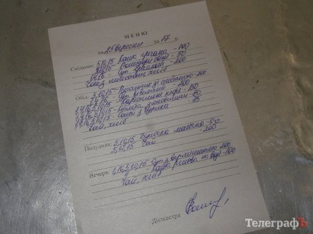 В подтверждение своего заявления депутат Терещенко предоставил меню (ниже на фото) и рассказал, что когда ребенок оказался в детской больнице, ему пришлось «на своей шкуре» убедиться в отвратительном качестве больничной еды. Также он рассказал, что детям до трех лет вообще не дают сливочное масло – а тем, кому дают, кусочек масла делят на крошечные кубики.