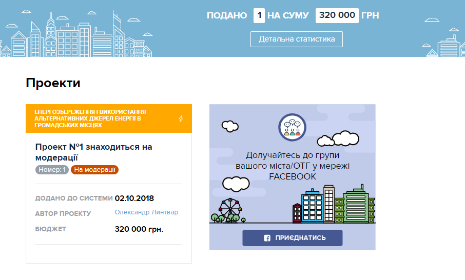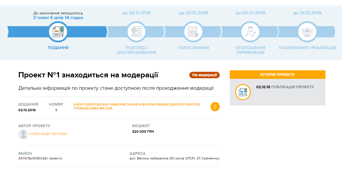 На сайті Громадського бюджету з’явився перший проект. Кременчужанин Олександр Линтвар пропонує за допомогою альтернативних джерел енергії зробити школу №16 енергозберігаючою. На реалізацію проекту необхідно 320 тисяч гривень. Поки проект знаходиться на модерації.