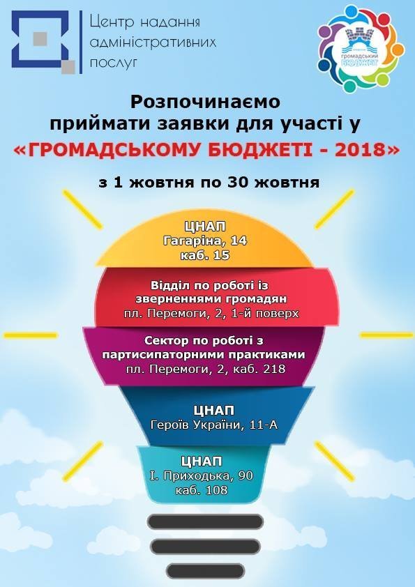 Кожен мешканець Кременчука, якому виповнилося 14 років, може подати ініціативу, яка буде реалізована за кошти міського бюджету. Ідеї щодо покращення своєї вулиці чи мікрорайону у вигляді проектної пропозиції приймаються з 1 по 30 жовтня 2018 року.