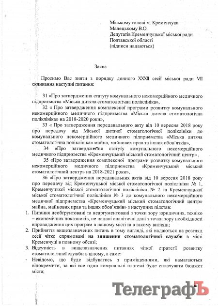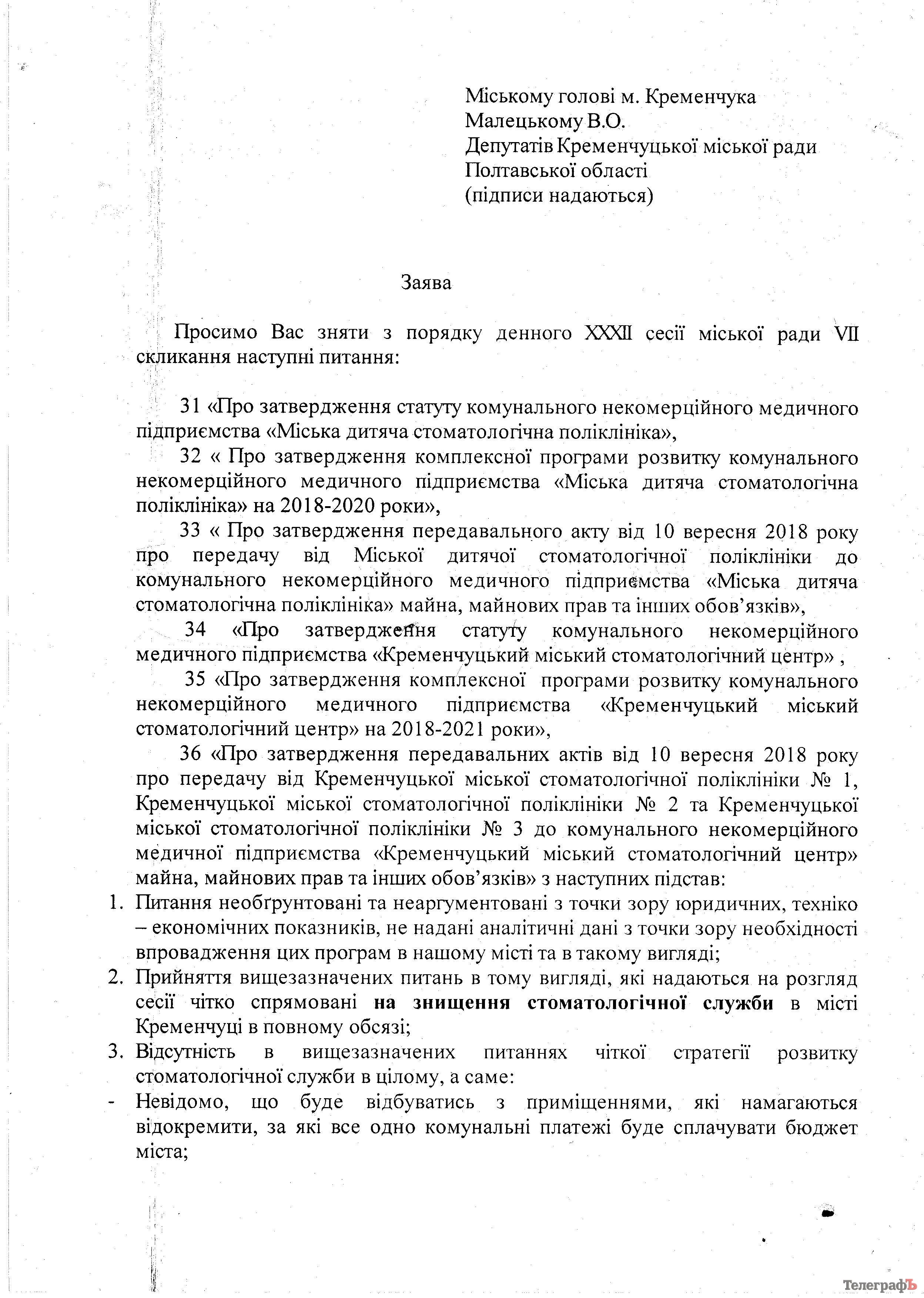 Члены комиссии составили письмо. В письме депутаты обосновывают свое предложение. Основной аргумент – представленная кременчугским горздравом программа реорганизации коммунальной стоматологической службы не подкреплена аналитическими данными и экономическими расчетами, доказывающими необходимость закрытия поликлиник и эффективность такого решения. Также депутаты указывают, что в программе, разработанной горздравом, нет четкой стратегии развития коммунальной стоматологической службы в дальнейшем.