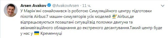 В Кременчуге появится симуляционный центр подготовки пилотов Airbus. Его создание анонсировал в своём твиттере Министр внутренних дел Украины Арсен Аваков.