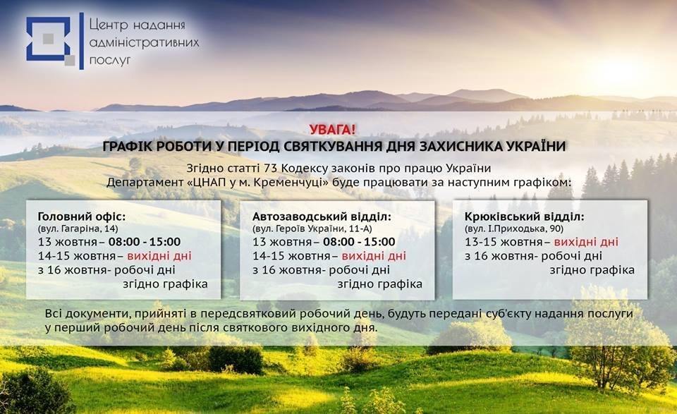У зв’язку з тим, що цього тижня українці матимуть 3 вихідних поспіль – суботу, неділю і понеділок – ЦНАПи Кременчука оприлюднили графік роботи у святкові дні.
