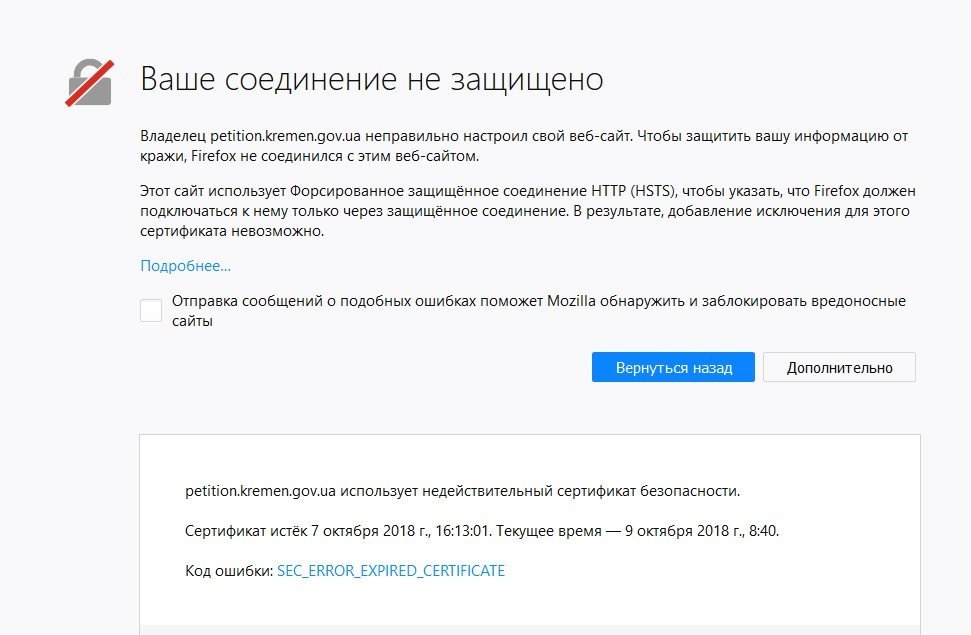 Владелец petition.kremen.gov.ua неправильно настроил свой веб-сайт – использует недействительный сертификат безопасности. Теперь браузеры не пускают на него пользователей, так как не могут защитить персональную информацию от кражи.