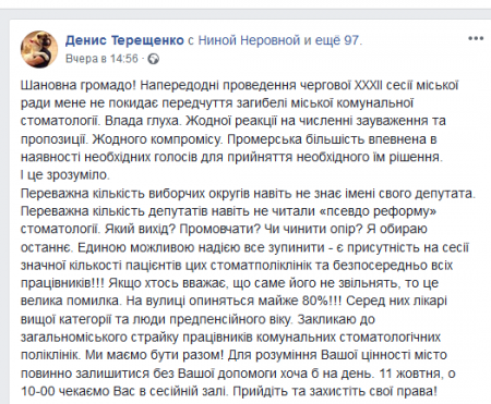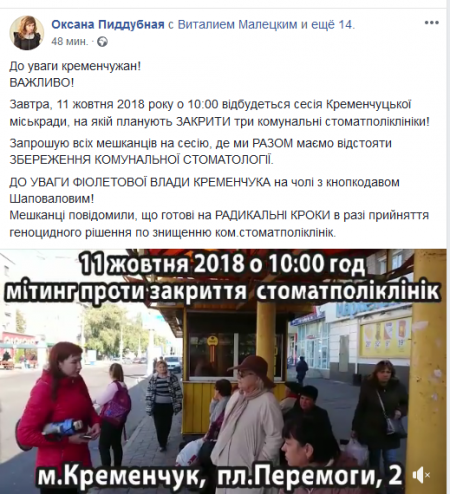 Депутаты Кременчугского горсовета Оксана Пиддубная и Денис Терещенко разместили каждый на своей странице в Фейсбук аналогичные призывы: зовут кременчужан прийти завтра, 11-го октября, в 10.00 на сессию горсовета – протестовать против закрытия трех коммунальных стоматологических поликлиник в Кременчуге, и уничтожения всей структуры районной коммунальной стоматологии.