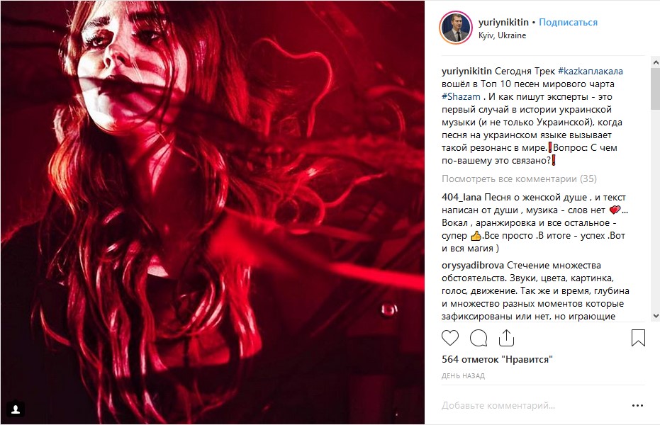 Український гурт Kazka, який нещодавно представив емоційне відео на пісню «Плакала», з цією піснею потрапив до топ-10 популярних пісень міжнародного чарту Shazam. Про це на своїй сторінці Instagram повідомив продюсер гурту Юрій Нікітін.