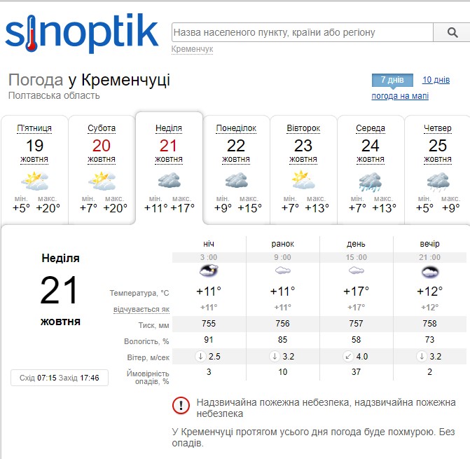 Sinoptik також прогнозує теплі але похмурі вихідні. Температура повітря у суботу, 20 жовтня, +20°C, у неділю, 21 жовтня, до +17°C.