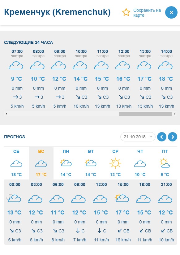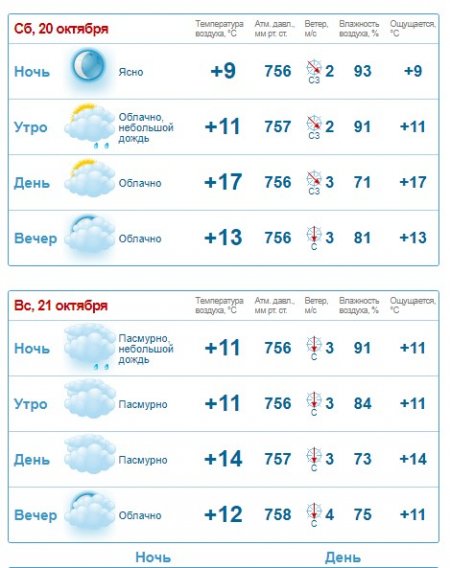 На Gismeteo прогнозують температурний мінімум на рівні +9°C, максимум - +17°C. У суботу, 20 жовтня, невеликий дощ слід чекати зранку, а у неділю, 21 жовтня - вночі.