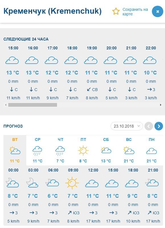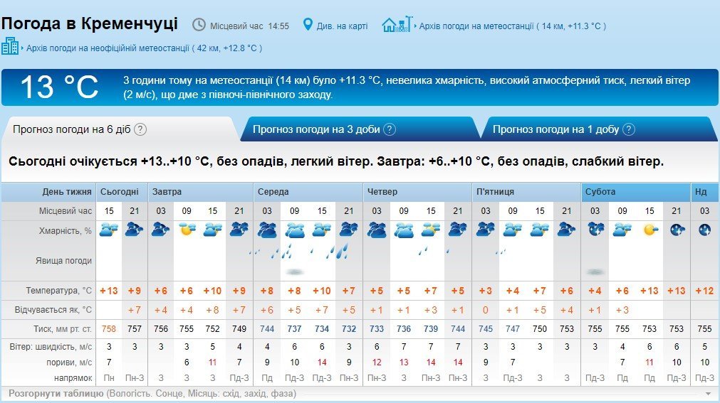 Rp5 обіцяє, що увесь тиждень буде досить вітряно – пориви до 14 м/с. Температура повітря коливатиметься від +3°C до +13°C. Ранок середи, 24 жовтня, та суботи, 27 жовтня, починатиметься з густого туману з видимістю до 1 км. Дощ прогнозують з середи по п’ятницю, 24-26 жовтня, включно.