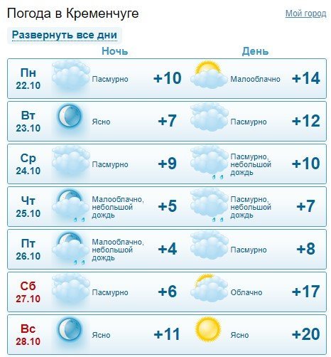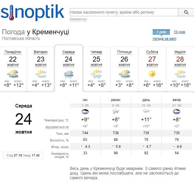 На Gismeteo прогнозують температурний мінімум на рівні +4°C, максимум – +20°C. З вівторка, 24 жовтня, по п’ятницю, 26 жовтня, дрібний дощ йтиме щодня. Ясно на цьому тижні буде лише у неділю, 28 жовтня.