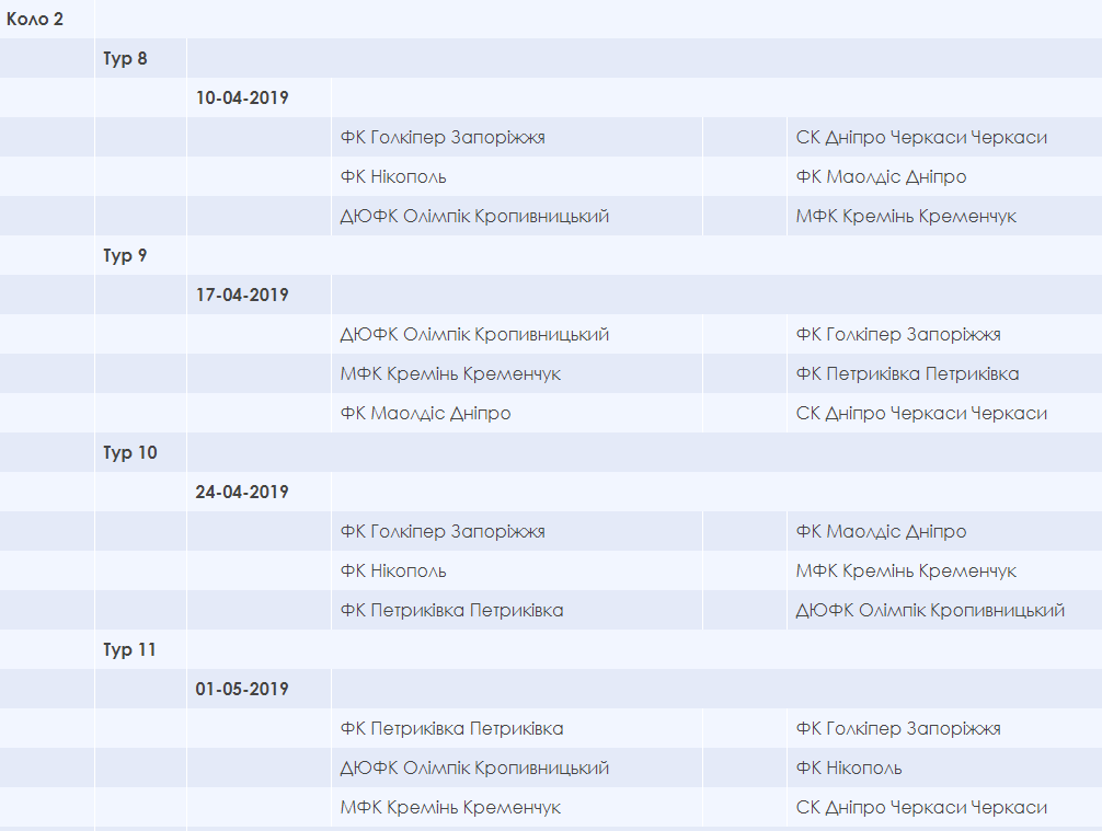 Друге коло чемпіонату стартує 10 квітня 2019 року. Перший матч в новому році кременчужани зіграють на виїзді у Кропивницькому.
