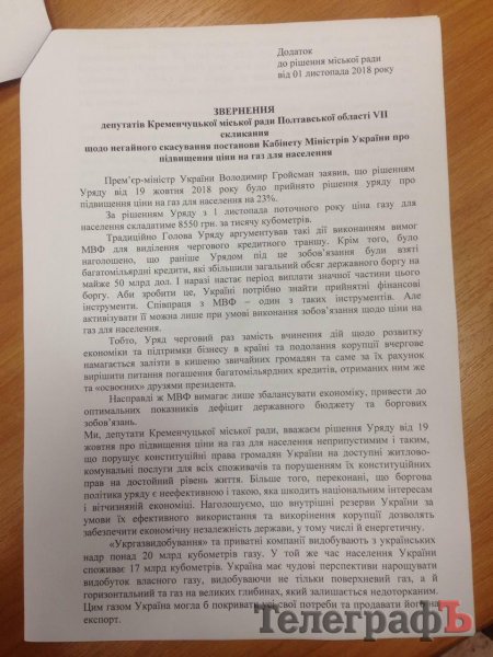 Дальнейшие события покажут, действительно ли пути двух давних соратников – депутата Головача и мэра Малецкого – разошлись. Или же их искусственно развели, чтобы не ставить мэра Кременчуга в неудобную позицию. Ведь депутат Головач, как член «Батьківщини», обязан поддерживать протестные акции, к которым призывает лидер «Батьківщини» Юлия Тимошенко. А Юлия Тимошенко громит правительство и президента. Но мэру Кременчуга как-то не очень удобно быть замешанным в акциях протеста против действий правительства и президента. Да ещё поддерживать Тимошенко – прямую соперницу президента. Возможно, поэтому эпицентр протестных настроений переместили в райраду, подальше от мэра. Давайте посмотрим, как будут развиваться события с созывом внеочередной сессии горсовета, на которой «Батьківщина» собирается требовать от президента отмены решения правительства о повышении цены на газ для населения. Вот проект этого решения.