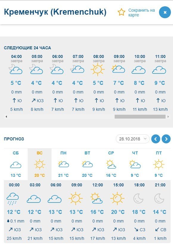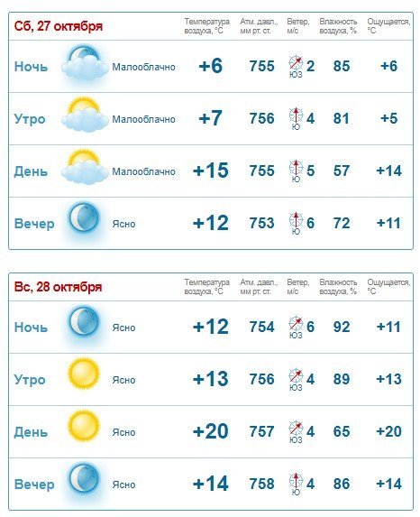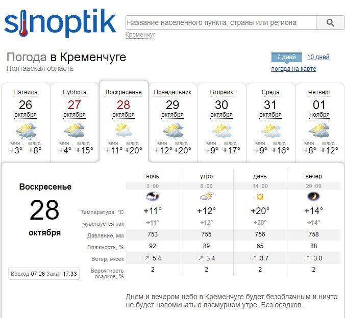 На Gismeteo прогнозують температурний мінімум на рівні +6°C, максимум – +20°C. У суботу, 27 жовтня, буде прохолодніше і похмуріше, а у неділю, 28 жовтня – тепліше і сонячніше.