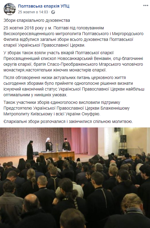 На зборах 25 жовтня під головуванням митрополита Полтавського і Миргородського Філіпа відбулися загальні збори всього духовенства Полтавської єпархії Української Православної Церкви. Після обговорення низки актуальних питань церковного життя на зборах прийняли одноголосне рішення визнати існуючий канонічний статус Української Православної Церкви найбільш оптимальним в нинішніх умовах.