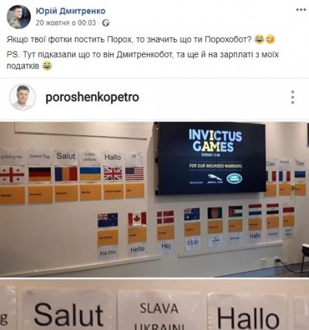 Юрій навіть в Австралії змусив волонтерів зняти з будівлі «Invictus Games House» вітання «Zdrastvuіte», розміщене під українським прапором.