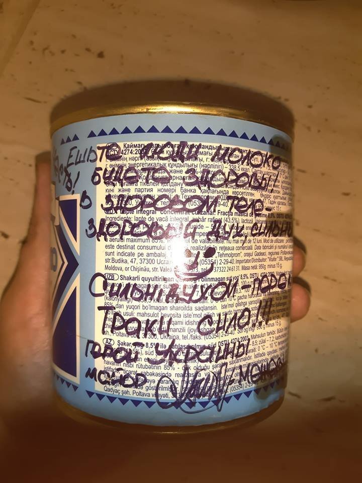 – Ви чули про легендарного танкіста, Героя України, майора Євгенія Межевікіна? Свого часу, я отримав від Нього банку армійського згущу, з побажаннями та автографом. Обіцяв Йому, що підсластю цим «горечь» від новини про смерть Х**ла. Не додержусь обіцянки. Вважаю, що Він зрозуміє. Продаю молоко згущене 0.5, цинк, (придатне до вживання) з автографом Героя України. Ціну встановлюйте ви, шляхом аукціону у коментарях, – написав Юрій.