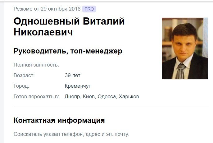 Директор коммунального предприятия «Теплоэнерго» Виталий Одношевный ищет работу. Свое резюме как топ-менеджер он разместил на сервисе поиска работу work.ua, оно датировано 29 октября. Он указал, что готов к переезду в Киев, Днипро, Одессу, Харьков. О своем опыте он написал «антикризисное управление предприятием», а также указал следующую информацию: