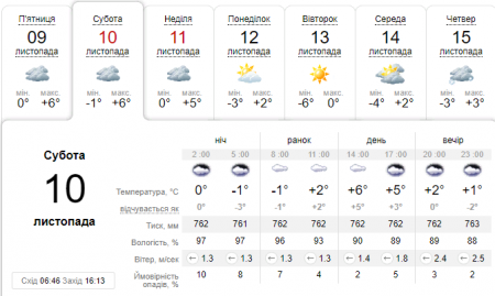 А от Gismeteo прогнозує невеличкий дощ у ранок суботи, 10 листопада. Неділя, 11 листопада, буде трішки теплішою, температура становитиме +7°C, однак без сонця.
