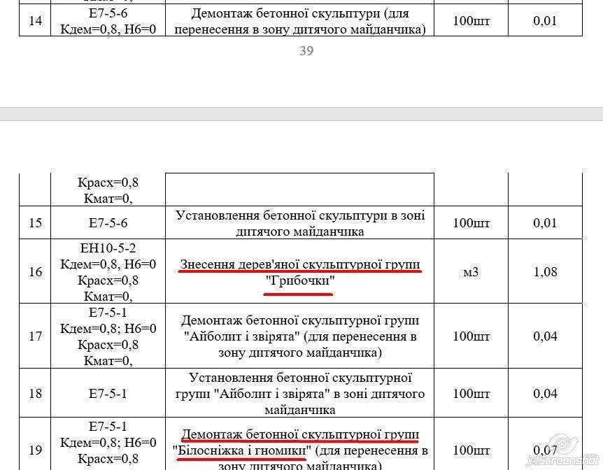 Білосніжка та грибочки — це скульптури, які вже знесені, але знову опинилися в кошторисі реконструкції парку. Але це лише маленька частинка: там ще й арка закоханих, і тир, і купу дерев, які спиляли в попередні роки, хочуть знести повторно.
