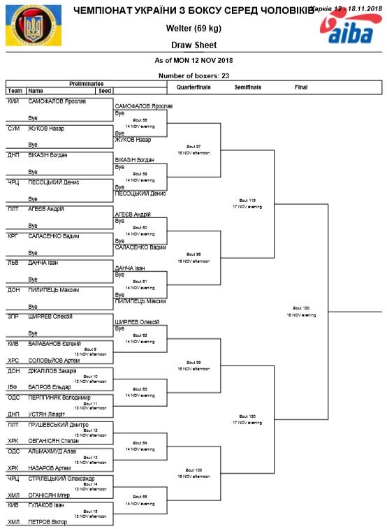 У ваговій категорії 69 кг виступають вихованці СК «Легіон» Андрій Агеєв та Дмитро Грушевський. Сьогодні, 13 листопада, Дмитро Грушевський зійдеться на ринзі з харків'янином Степаном Овганісяном.