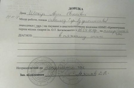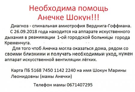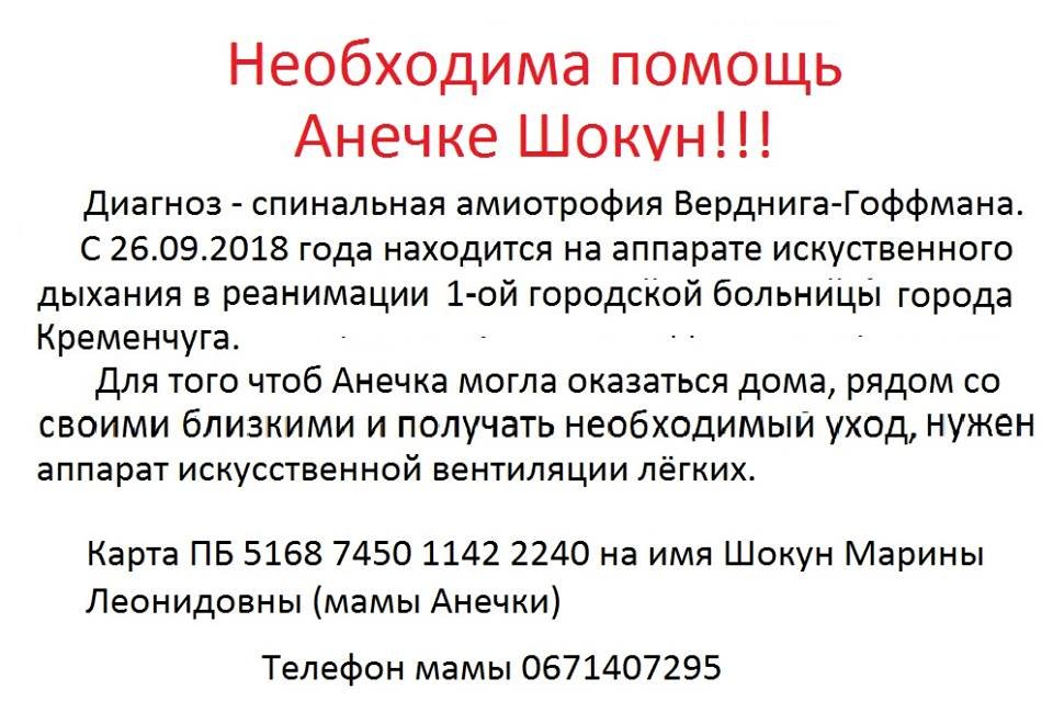 Анна Шокун має діагноз спинальна аміотрофія Вердніга-Гоффмана. З 26 вересня 2018 року знаходиться на апараті штучного дихання в реанімації 1 міської лікарні Кременчука.