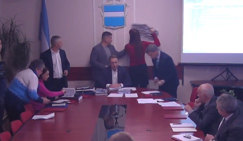 Она повесила плакаты над рабочим местом городского головы, но тут члены исполкома стали их снимать. Особенно усердствовали сам мэр, который оторвал кусочек плаката, и вице-мэры Владимир Пелипенко и Дмитрий Кравченко. Заседание исполкома на несколько минут задержалось.