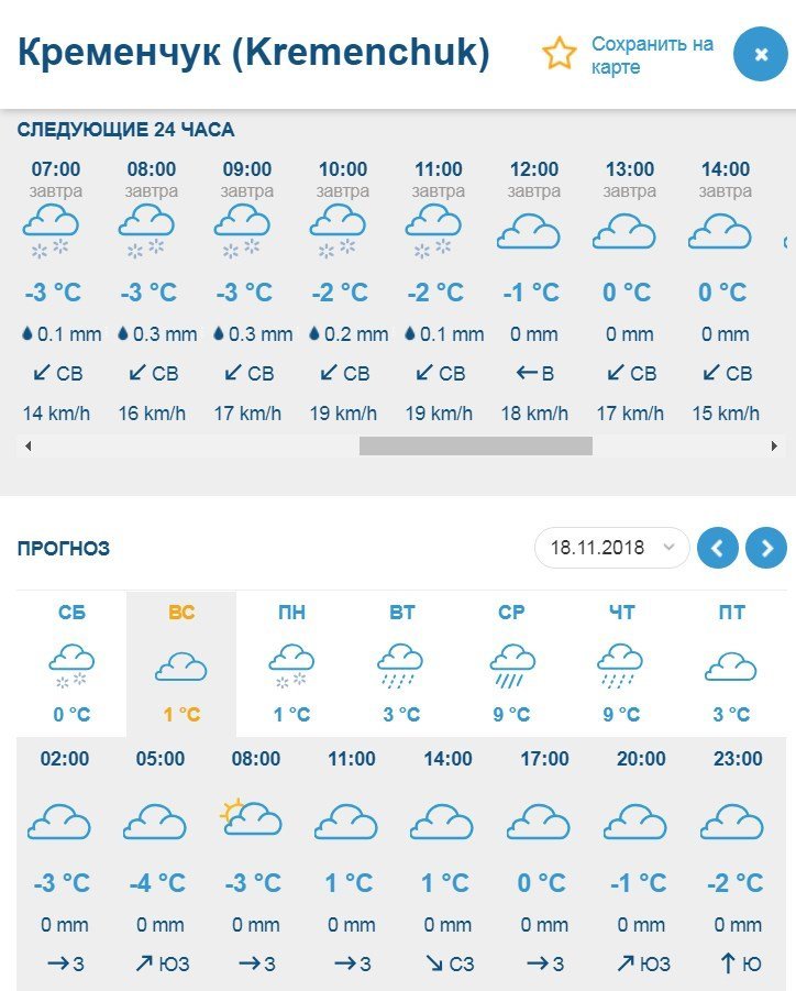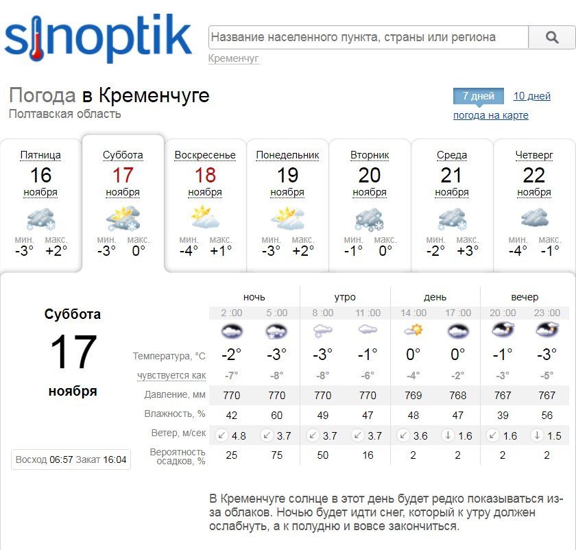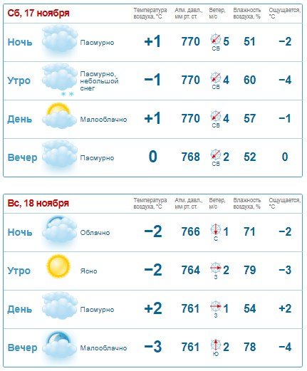 Rp5 обіцяє, що температура повітря, в основному, триматиметься на рівні -1°C…+2°C. Дрібного снігу слід чекати і в суботу, 17 листопада, і у неділю, 18 листопада. Також ввечері неділі на місто впаде густий туману з видимістю менше 1 км. Увесь вікенд буде досить вітряно – пориви до 11 м/с.