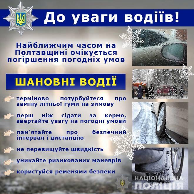 20 листопада прес-служба поліції Полтавщини оприлюднила карту снігопаду та ожеледиці в області. Особливо уважними та обережними потрібно бути водіям у таких районах:
