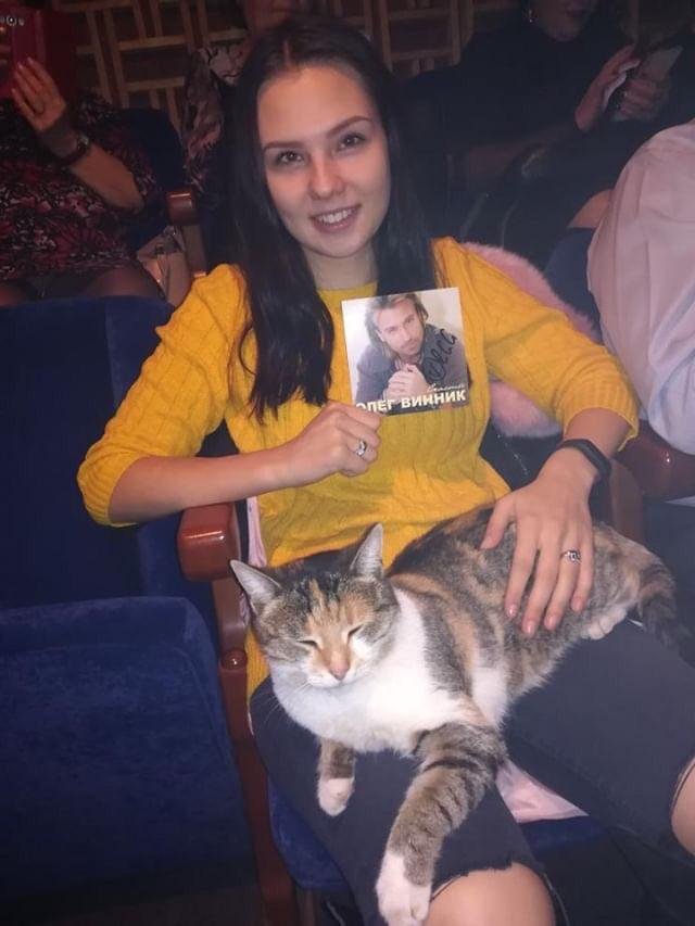 – Мы смотрели концерт, сидели на балконе в конце, – рассказывает девушка. – Я глянула под ноги, а там кошка трехцветная. Она умостилась мне на руки и просидела так почти весь концерт. Кошка даже не боялась громких звуков.