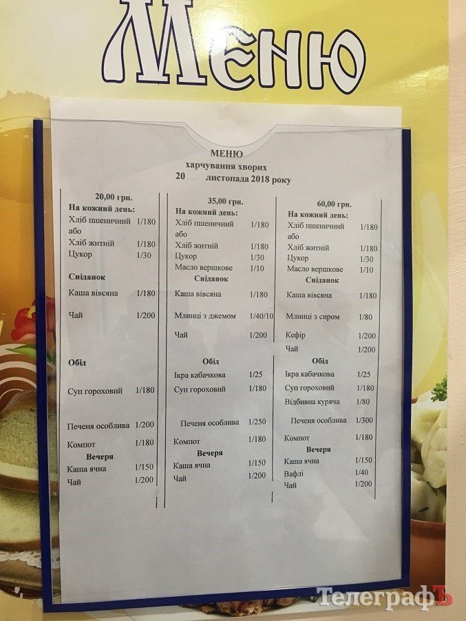 «Приднепровская» работает с пациентами, имеющими страховку. Так что здесь сумму на питание в сутки определяет не кременчугский горсовет, а страховые компании. В связи с этим в «Приднепровской» кормят пациентов по трем видам меню: 20 грн/сутки; 35 грн/сутки; 60 грн/сутки.