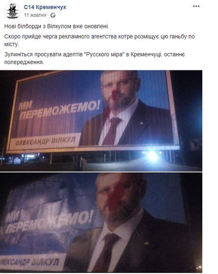 В Кременчуге портреты Александра Вилкула заливают краской не впервые. В сентябре и в октябре организация С14 Кременчуг неоднократно выкладывала на своей странице в Фейсбук фото залитого Вилкула с сопроводительными записками такого рода: «Нові білборди з Вілкулом вже оновлені».