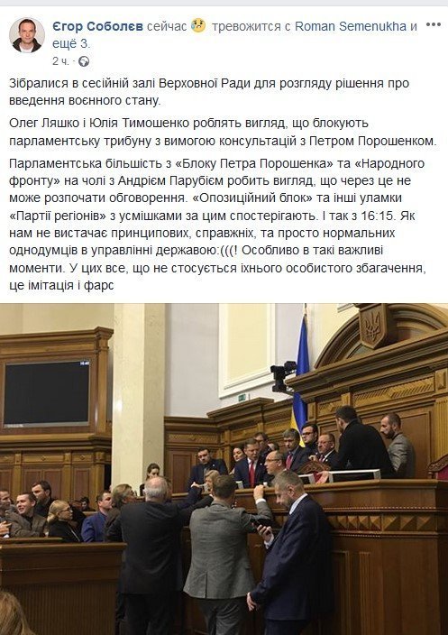 Политический обозреватель, нардеп Сергей Лещенко в Фейсбук ведет прямую трансляцию из зала Верховной Рады. Он сообщает, что заседание до сих пор не началось. Лещенко озвучил свою версию событий. По его версии, президент Порошенко требует введения военного положения в стране с целью отсрочки президентских выборов или для того, чтобы их вообще не проводить в ближайшее время. Лещенко говорит, что у президента Порошенко катастрофиески низкие рейтинги – 5-8%, и выборы в такой ситуации ему не выгодны.