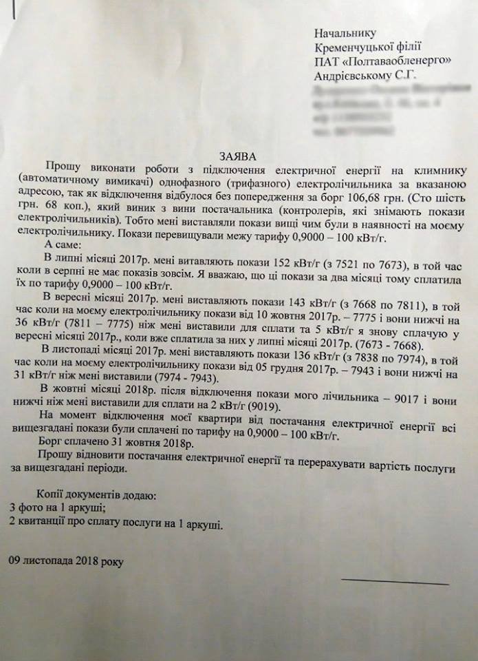 За її словами, ніякого попередження про відключення вона не отримувала, хоча в енергокомпанії їй сказали, що його нібито надіслали поштою. Вона написала заяву до «Полтаваобленерго» про спірні борги, але таки оплатила їх, щоб не сидіти без світла (копія квитанції є в редакції).