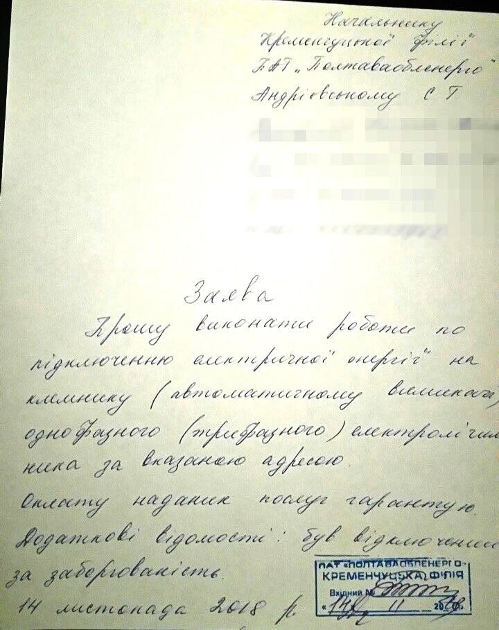 Після сплати пішла до «Полтаваобленерго» подавати заяву на підключення електроенергії. Проте, за її словами, заявку просто не прийняли — і відправили до іншого відділу компанії «Полтаваобленерго» узгоджувати оплату боргів за тепло.