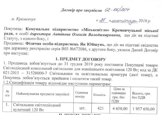 У договорі йдеться, що світильники мають поставити покупцеві («Міськсвітлу») до кінця 2019 року.