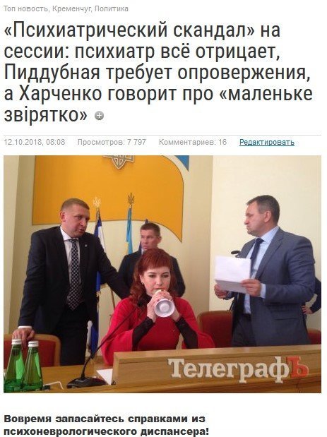 И заказ крайне сомнительной психиатрической экспертизы, и утечка информации о её результатах в провластные издания, и сегодняшнее предложение мэра поделиться психиатром с Пиддубной, – всё это, по версии «Телеграфа», имеет признаки компании по дискредитации оппозиционного депутата. Пиддубная ведь серьезно досаждает команде власти – и не просто досаждает криком, а выигрывает немало судебных исков против решений власти – в частности, по тарифам «Теплоэнерго».