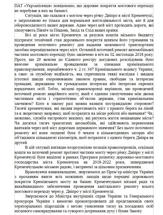 Наприкінці звернення — прохання до прем'єр-міністра якнайшвидше передати дорожнє покриття міста на баланс Кременчуцької міськради та вимога до міністра МВС та Генпрокурора «проконтролювати дії представників своїх територіальних підрозділів з метою уникнення тиску на посадових осіб місцевого самоврядування та суворого дотримання духу і букви Закону».