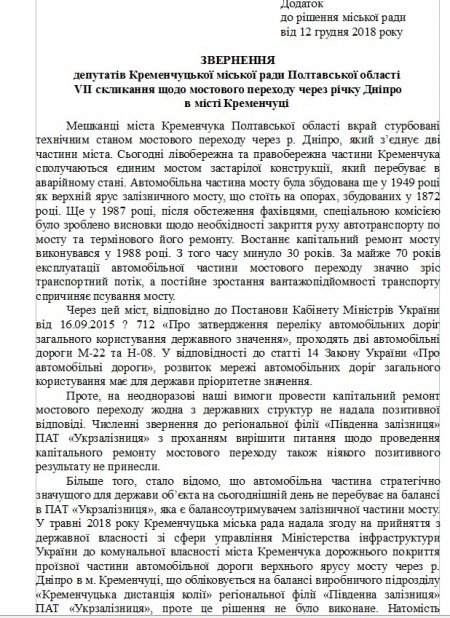 На чергову сесію Кременчуцької міської ради депутат Дмитро Лозовик підготував звернення стосовно Крюківського мосту до прем'єр-міністра, міністра МВС та Генпрокурора. Він запропонує колегам-депутатам підтримати це звернення.