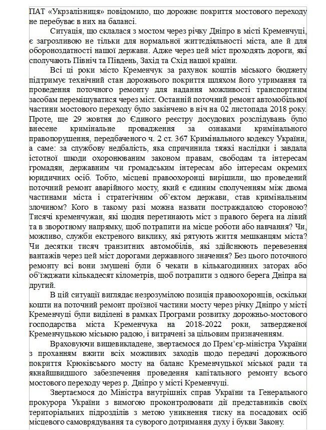 Наприкінці звернення — прохання до прем’єр-міністра якнайшвидше передати дорожнє покриття міста на баланс Кременчуцької міськради та вимога до міністра МВС та Генпрокурора «проконтролювати дії представників своїх територіальних підрозділів з метою уникнення тиску на посадових осіб місцевого самоврядування та суворого дотримання духу і букви Закону».