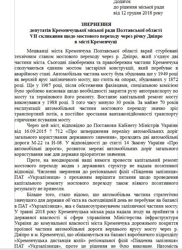 З’явилося воно як наслідок подій із ремонтом Крюківського мосту, який здійснили за кошти міського бюджету, хоча дорожнє покриття мосту не перебуває у комунальній власності. Тому використання бюджетних коштів міста на цей об’єкт і привернуло увагу правоохоронців, які порушили кримінальну справу за службову недбалість посадових осіб, що спричинила тяжкі наслідки.