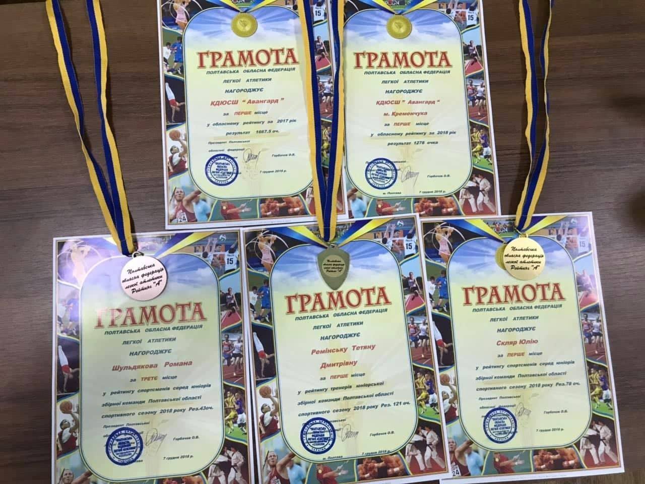 - Міська федерація легкої атлетики м. Кременчука за 1 місце у обласному рейтингу за 2018 рік (результат 2595 оч.)