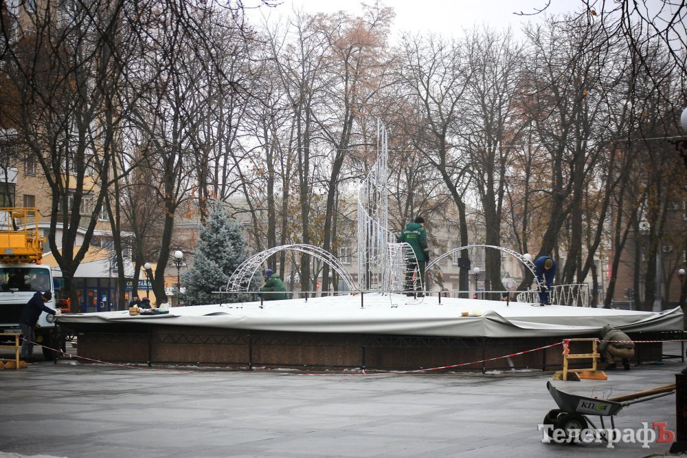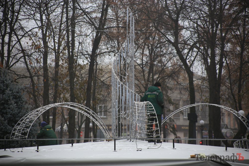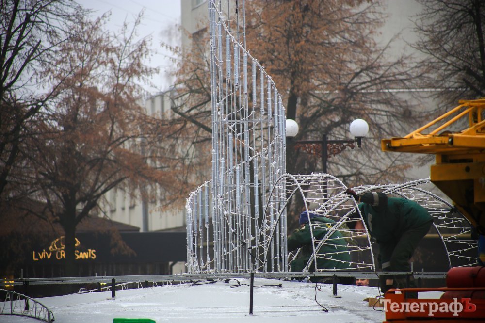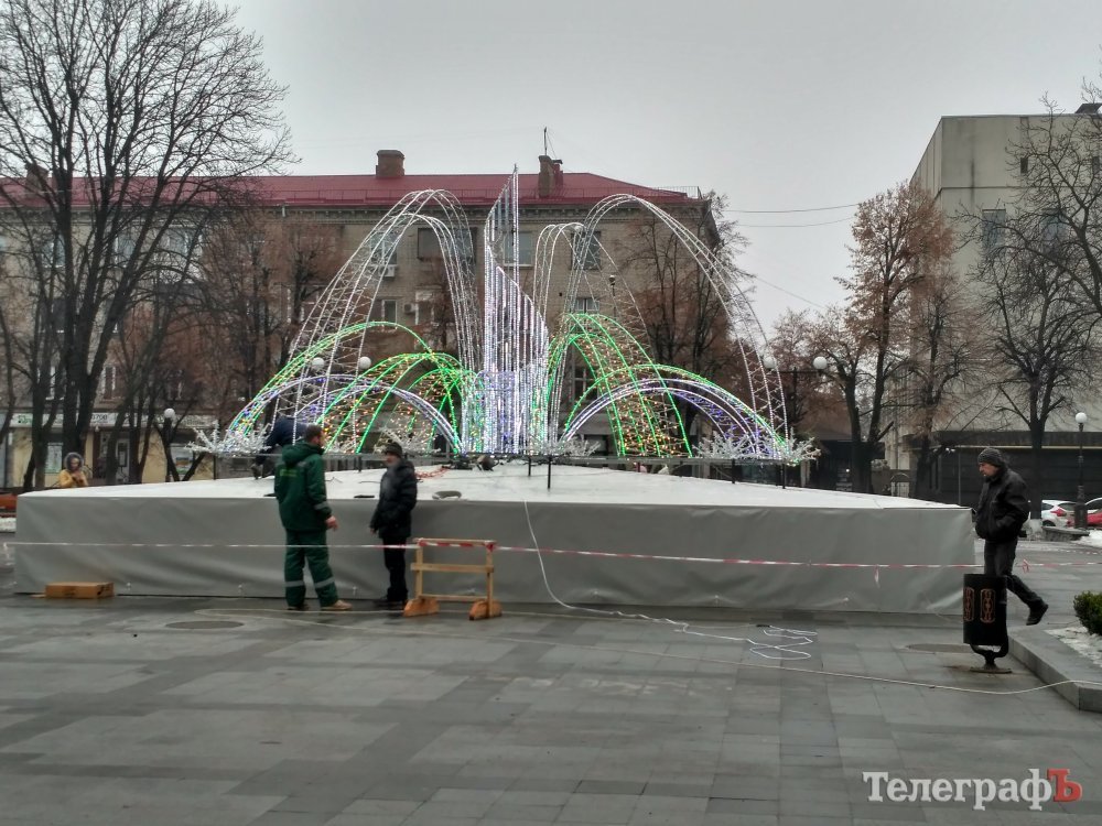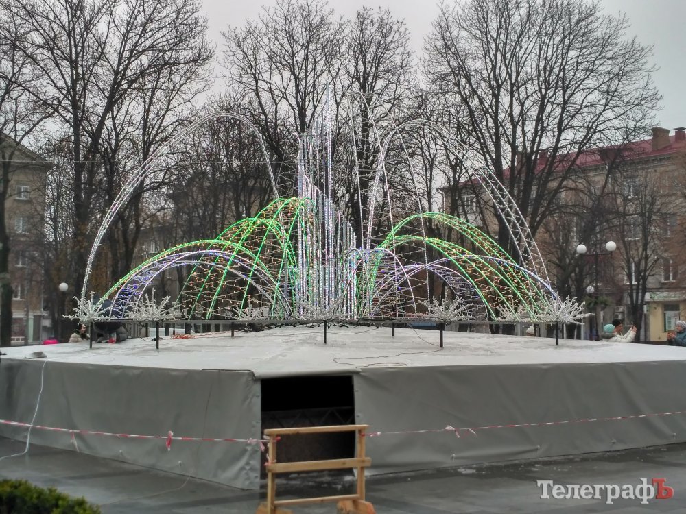 Прикрашати водограй почали сьогодні. На фонтан встигли змонтувати деякі частини конструкції.