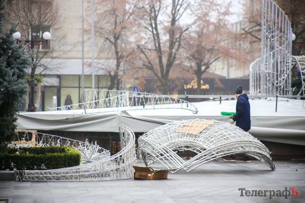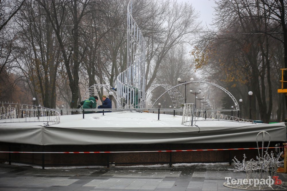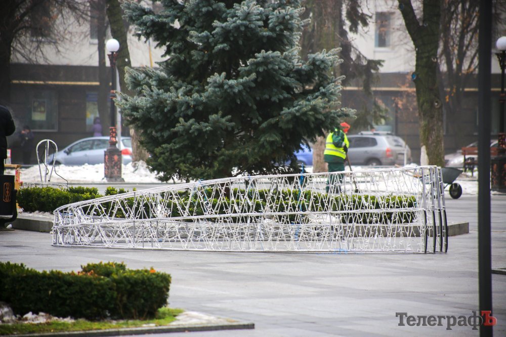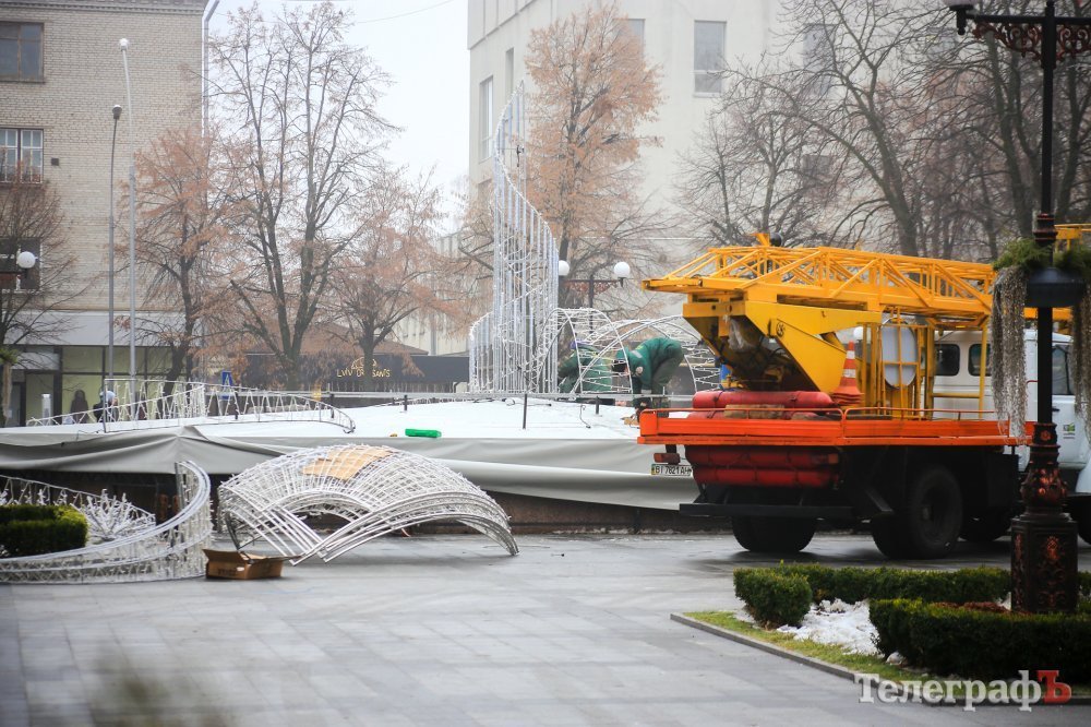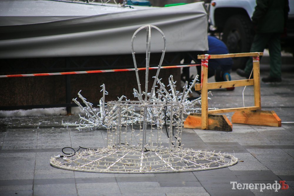 Прикрашати водограй почали сьогодні. На фонтан встигли змонтувати деякі частини конструкції.