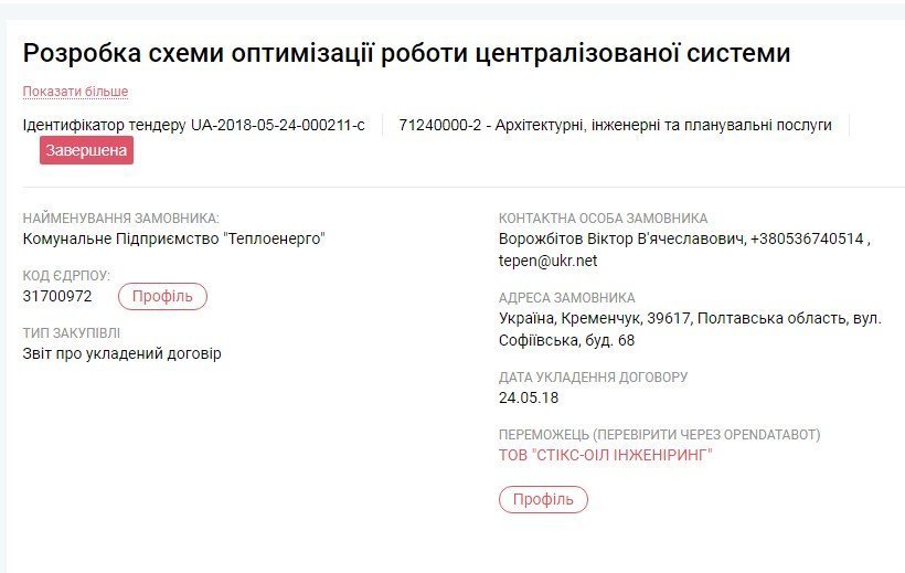 Предмет закупівлі – «Розробка схеми оптимізації роботи централізованої системи теплопостачання міста Кременчук». За 999 999 гривень, відповідно до договору, фірма Стікс-Оіл Інжинірінг» береться оптимізувати систему теплопостачання — надати архітектурні, інженерні та планувальні послуги згідно технічного завдання.