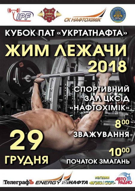 Традиційна відкрита першість з пауерліфтингу «Жим лежачи 2018» на Кубок ПАТ «Укртатнафта» відбудеться 29 грудня. Змагання присвячені Новорічним та Різдвяним святам відбудуться в СК «Нафтохімік».