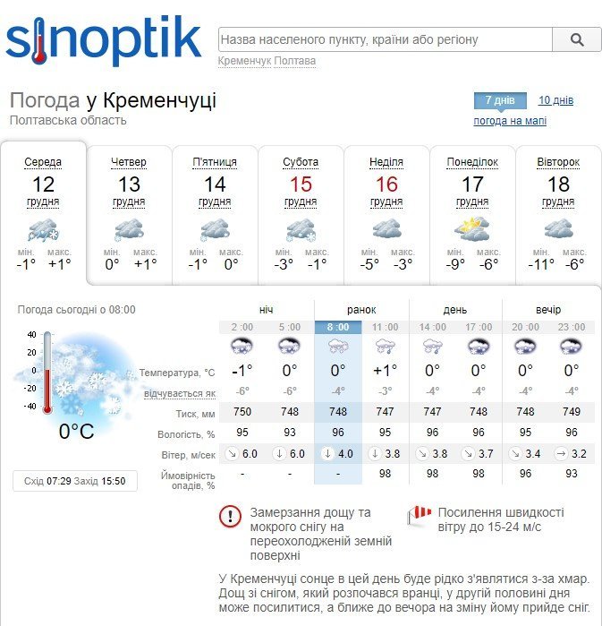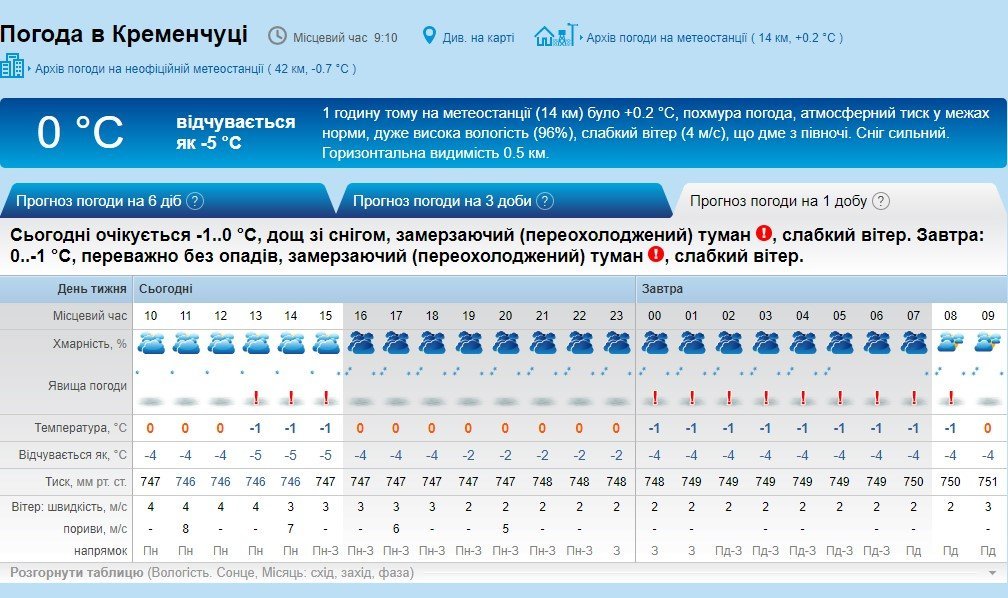 Попередження про погіршення погодних умов є і на Sinoptik: дощ зі снігом, який розпочався вранці, у другій половині дня може посилитися, а ближе до вечора на зміну йому прийде сніг. також тут попереджають про замерзання дощу та мокрого снігу на переохолодженій земній поверхні та посилення швидкості вітру до 15-24 м/с.