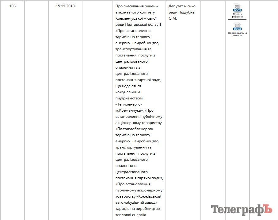Давайте посмотрим документы – по версии «Телеграфа», первопричина шумного спектакля в них. Смотрим вопрос №103 – «Про скасування рішення виконавчого комітету… про встановлення тарифів на теплову енергію та гаряче водопостачання КП «Теплоенерго»,… ПАТ «Полтаваобленерго», … теплову енергію ПАТ «КВБЗ».