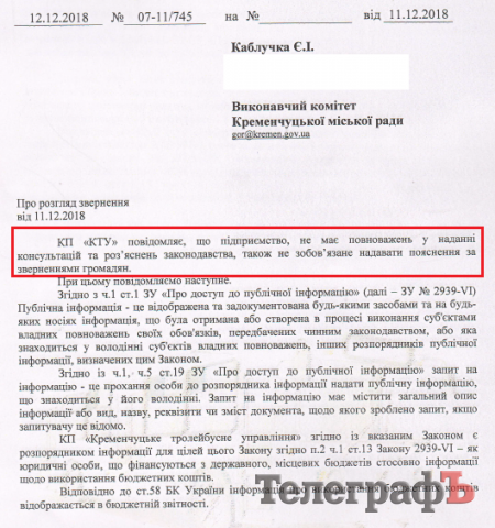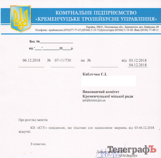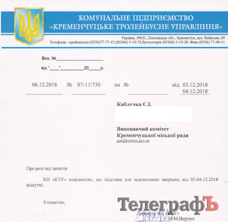 Через кілька днів надійшла відповідь. У листі за підписом директора Олександра Вертюха комунальне підприємство «Кременчуцьке тролейбусне управління» повідомило, що підстави для задоволення наших запитів (які чомусь назвали зверненнями) відсутні.